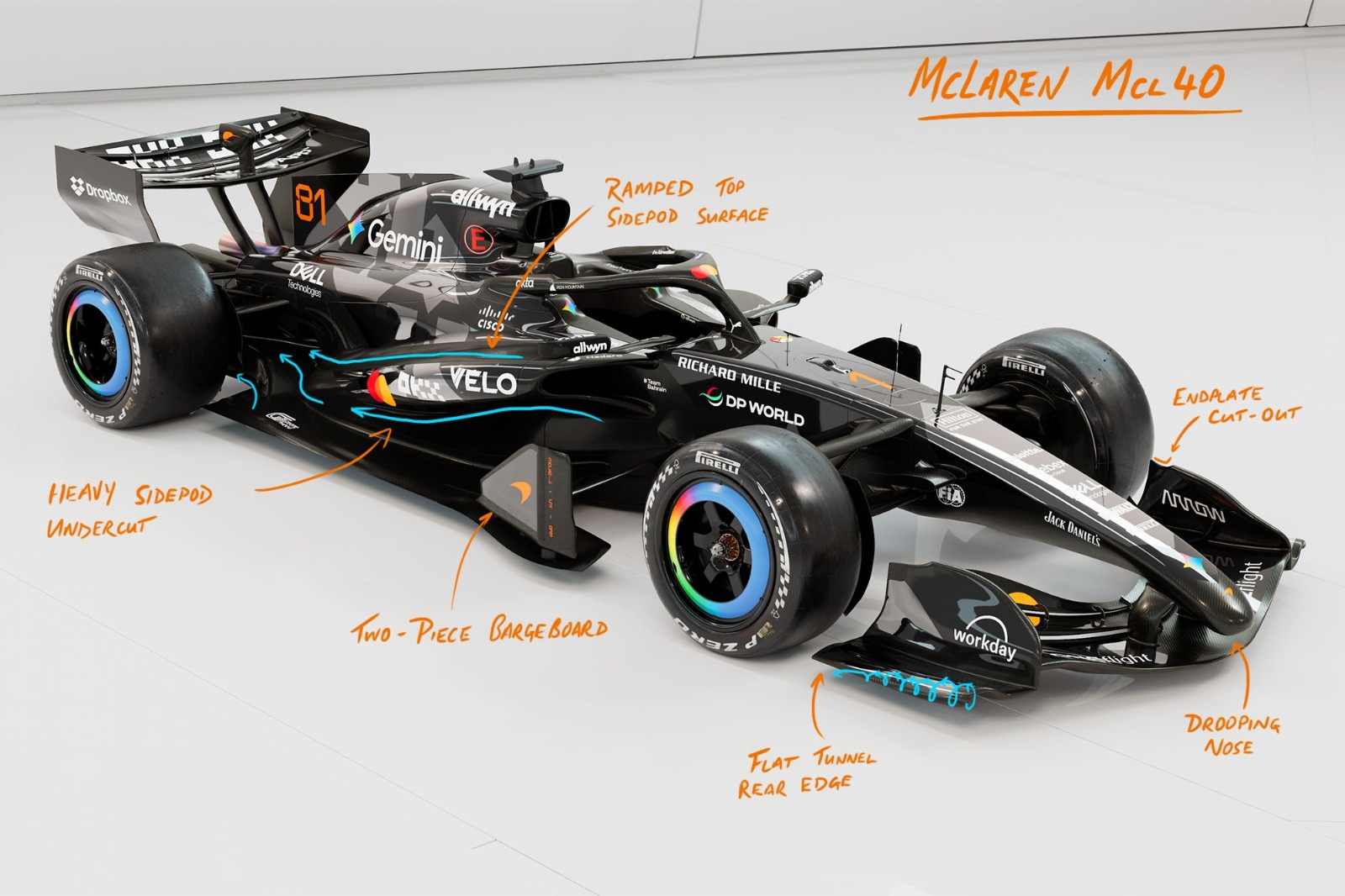 Set off by a drooping nose, the MCL40 has been shown with a curvaceous front wing that lifts up at the outboard sections to assist with trimming the front wheel wake. The endplates, featuring a small cut-out on the top edge, appear to be responsible for both in- and out-wash to contain that wake, ensuring the turbulence shed by the tyres is less likely to bleed into the underbody. The footplate features the standard vortex tunnel, squashed at the trailing edge to allow this to be fired outboard to enhance any out-wash wake management.